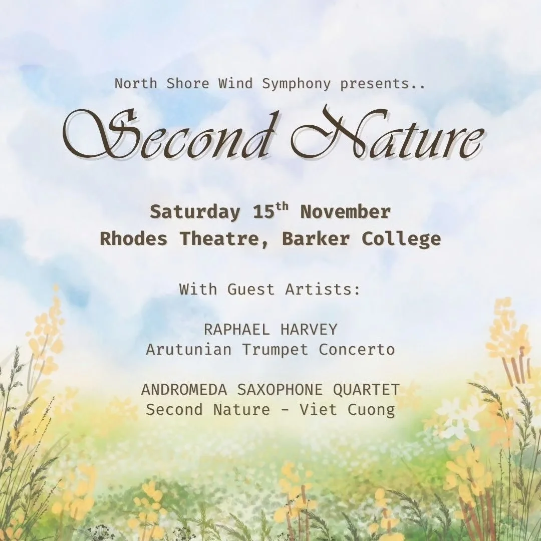 The North Shore Wind Symphony are joined by trumpeter Raphael Harvey and Sydney-based saxophone quartet Andromeda Sax Quartet. Andromeda have performed in the Australian Festival of Chamber Music and were Featured Artists in the Dots+Loops PLAYBACK Festival. They will be performing Second Nature by Viet Cuong, a concerto for saxophone quartet and wind symphony.